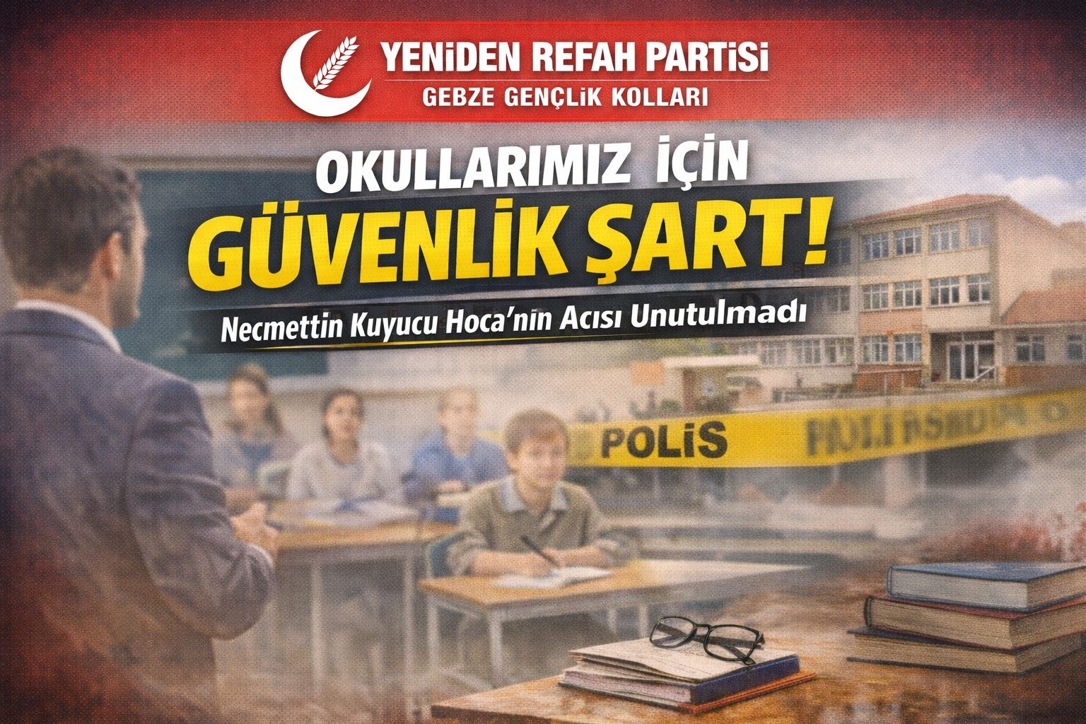 Özellikle Gebze’mizde yaşanan ve hepimizin hafızasında derin bir yara olarak kalan Şehit Öğretmen Necmettin Kuyucu Hocamızın acı hatırası, okul güvenliği meselesinin ne kadar hayati olduğunu bir kez daha göstermiştir. Necmettin Hocamızın uğradığı menfur saldırı, eğitim kurumlarımızda güvenliğin asla ihmal edilmemesi gerektiğini açık şekilde ortaya koymuştur. Bu acıyı unutmadan, benzer hadiselerin bir daha yaşanmaması için somut ve uygulanabilir adımların atılması gerektiğine inanıyoruz. Necmettin Kuyucu’nun, Gebze Atatürk Anadolu Lisesi’nde bir öğrencisinin bıçaklı saldırısı sonucu yaşamını yitirdiği olay kamuoyuna bu şekilde yansımıştır.